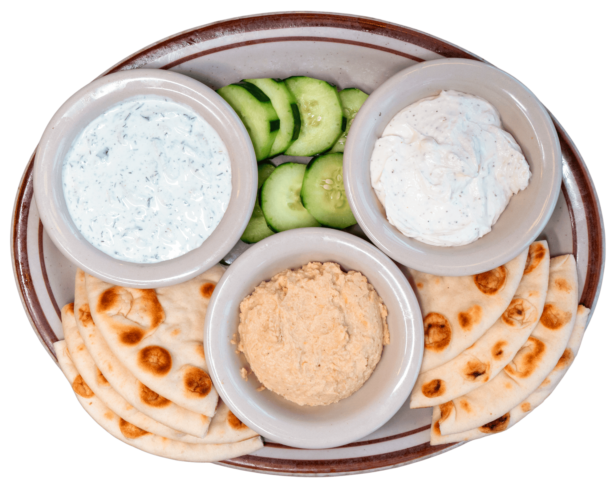 side of hummus, tzatziki, or feta spread with pita wedges and cucumbers